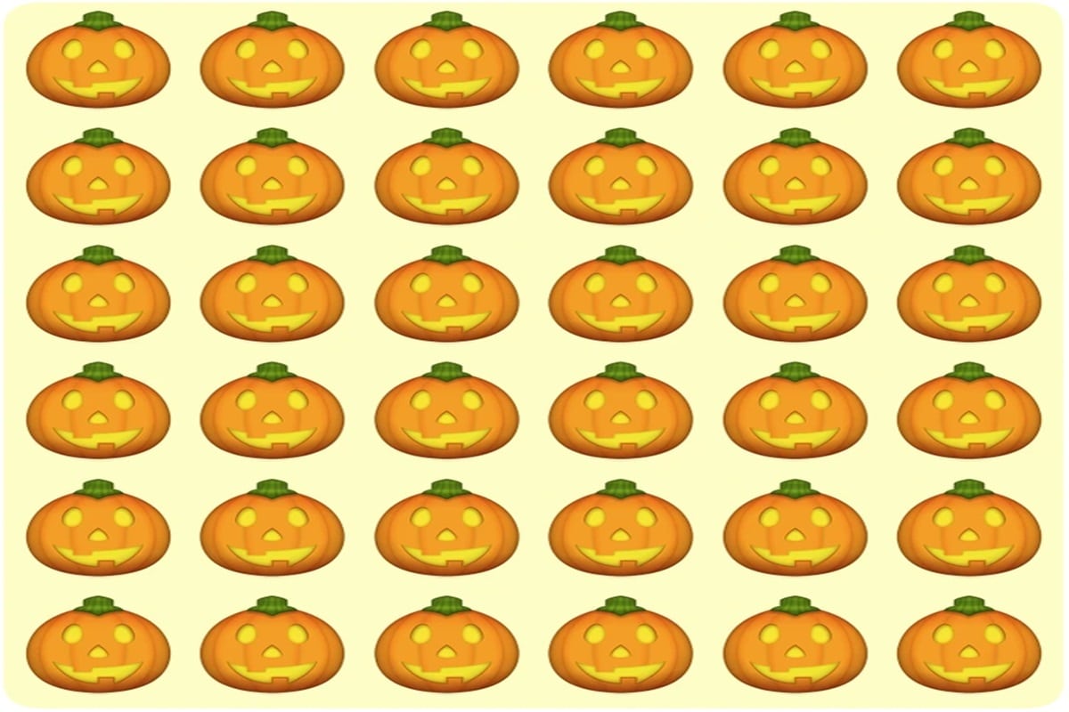 Imagem mostra várias abóboras organizadas em fileiras idênticas, exceto por uma diferente, desafiando a sua percepção neste teste visual. O desafio é encontrar a única abóbora diferente em até 20 segundos, colocando sua atenção à prova.