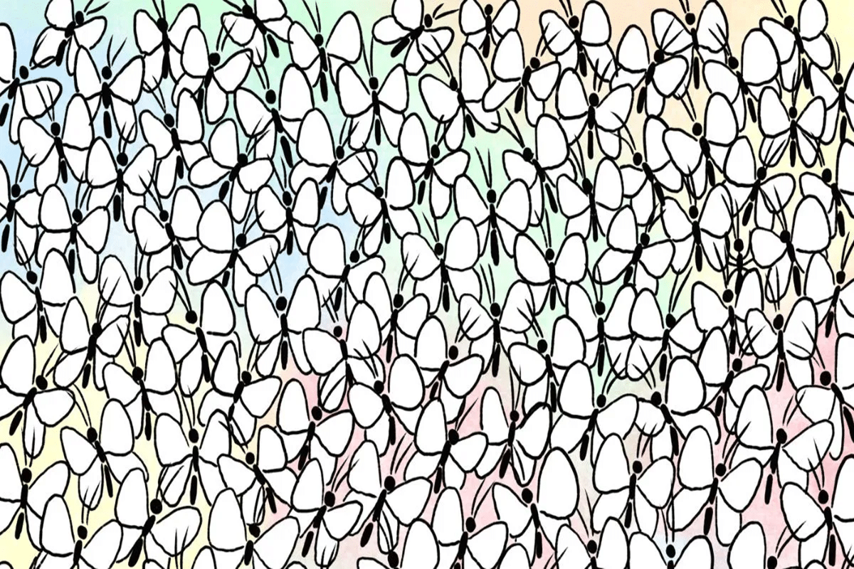 Observe atentamente a imagem. Ela está repleta de borboletas brancas com contornos pretos, todas muito parecidas entre si, espalhadas sobre um fundo colorido em tons pastéis. No meio de todas essas borboletas, há uma pequena formiga escondida. Seu objetivo é localizá-la no menor tempo possível.