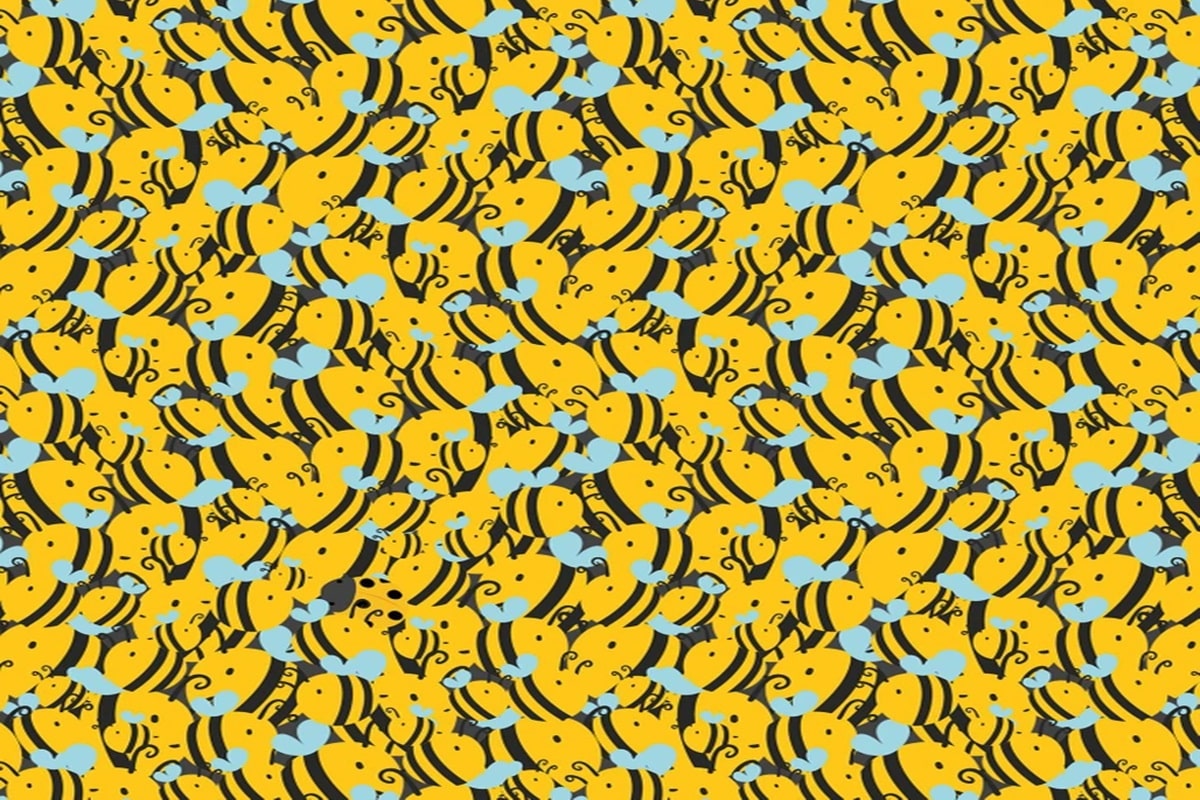 Na imagem, há um padrão visual com várias abelhas-amarelas de asas azuis. O desafio de hoje é encontrar, em até 30 segundos, a joaninha escondida.