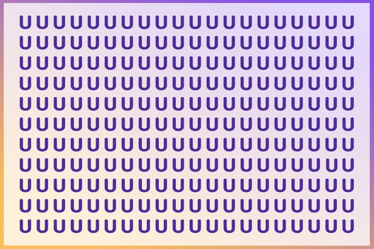 Prepare-se para o desafio de hoje, que vai testar sua percepção! Analise a imagem que apresenta várias de letras U em roxo sobre um fundo degradê, com uma única letra diferente escondida. O desafio é identificar essa letra diferente em meio às muitas letras idênticas. Você consegue adivinhar qual é a letra em apenas 20 segundos?