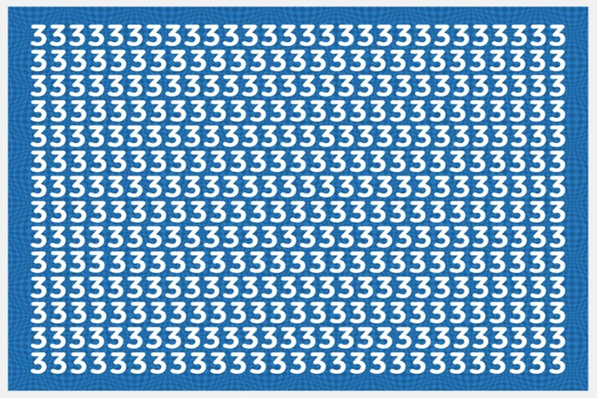 Prepare-se para o desafio de hoje, que vai testar sua percepção! Analise a imagem que apresenta uma repetição do número 3 em cor branca sobre um fundo azul, formando um padrão visual. Entre os números, há uma letra E escondida. Você consegue achar a letra E em até 25 segundos?