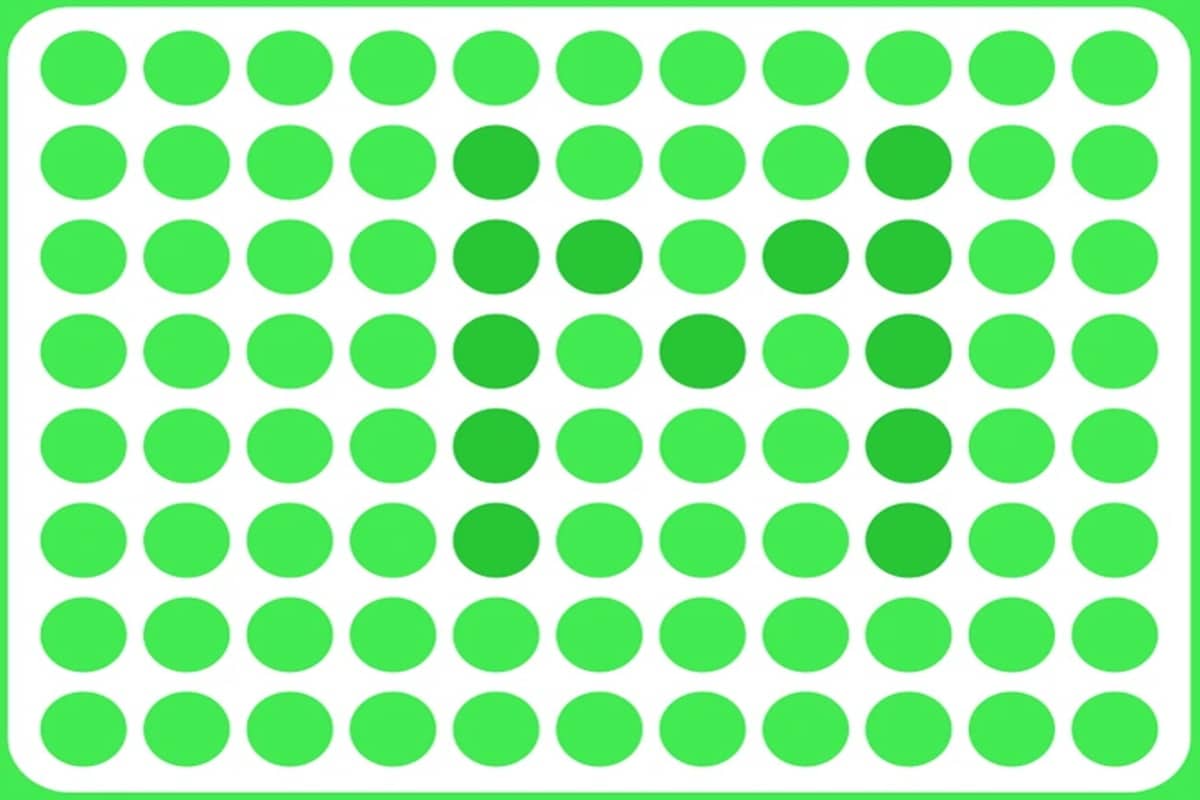 Prepare-se para o desafio de hoje, que vai testar sua percepção! A imagem mostra um padrão regular de círculos verdes em dois tons, organizados em linhas, sobre um fundo branco com bordas verdes arredondadas, criando um efeito visual de repetição e variação de cores. Será que você consegue encontrar a letra M escondida nesta imagem em até 30 segundos?