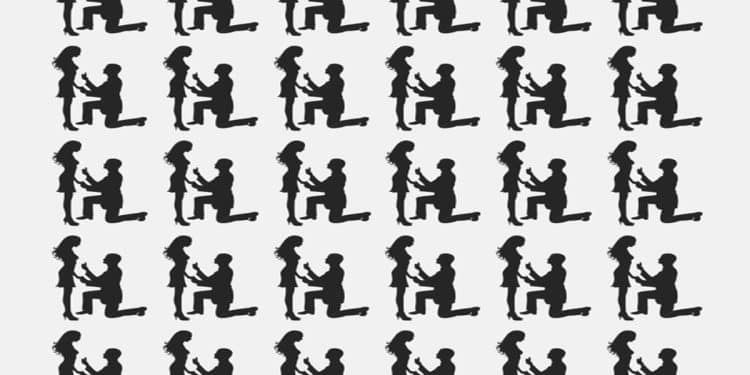 Prepare-se para o desafio de hoje, que vai testar sua percepção! Analise a imagem mostra várias silhuetas pretas sobre um fundo cinza, retratando um homem ajoelhado oferecendo um anel a uma mulher em pé, simbolizando um pedido de casamento. Será que você consegue achar a silhueta diferente em até 30 segundos?