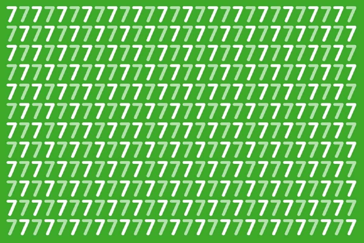Prepare-se para o desafio de hoje, que vai testar sua percepção! Observe com bastante atenção, a imagem apresenta uma série de números 7 em verde claro e escuro, com o objetivo de encontrar o número 1 que está camuflado entre eles.