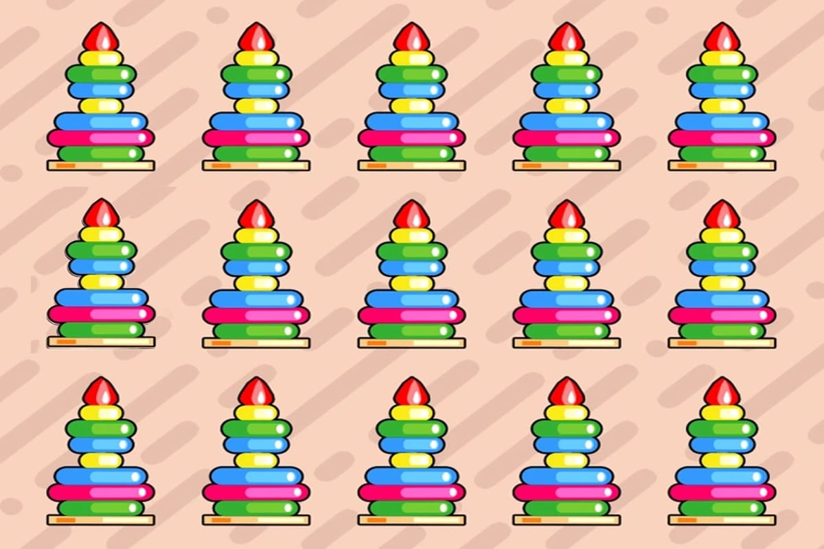 Prepare-se para o desafio de hoje, que vai testar sua percepção! Analise a imagem que mostra diversas pilhas de anéis coloridos empilhados em ordem, com base quadrada e uma peça vermelha no topo, em um fundo bege. Você consegue achar o brinquedo diferente em menos de 20 segundos?