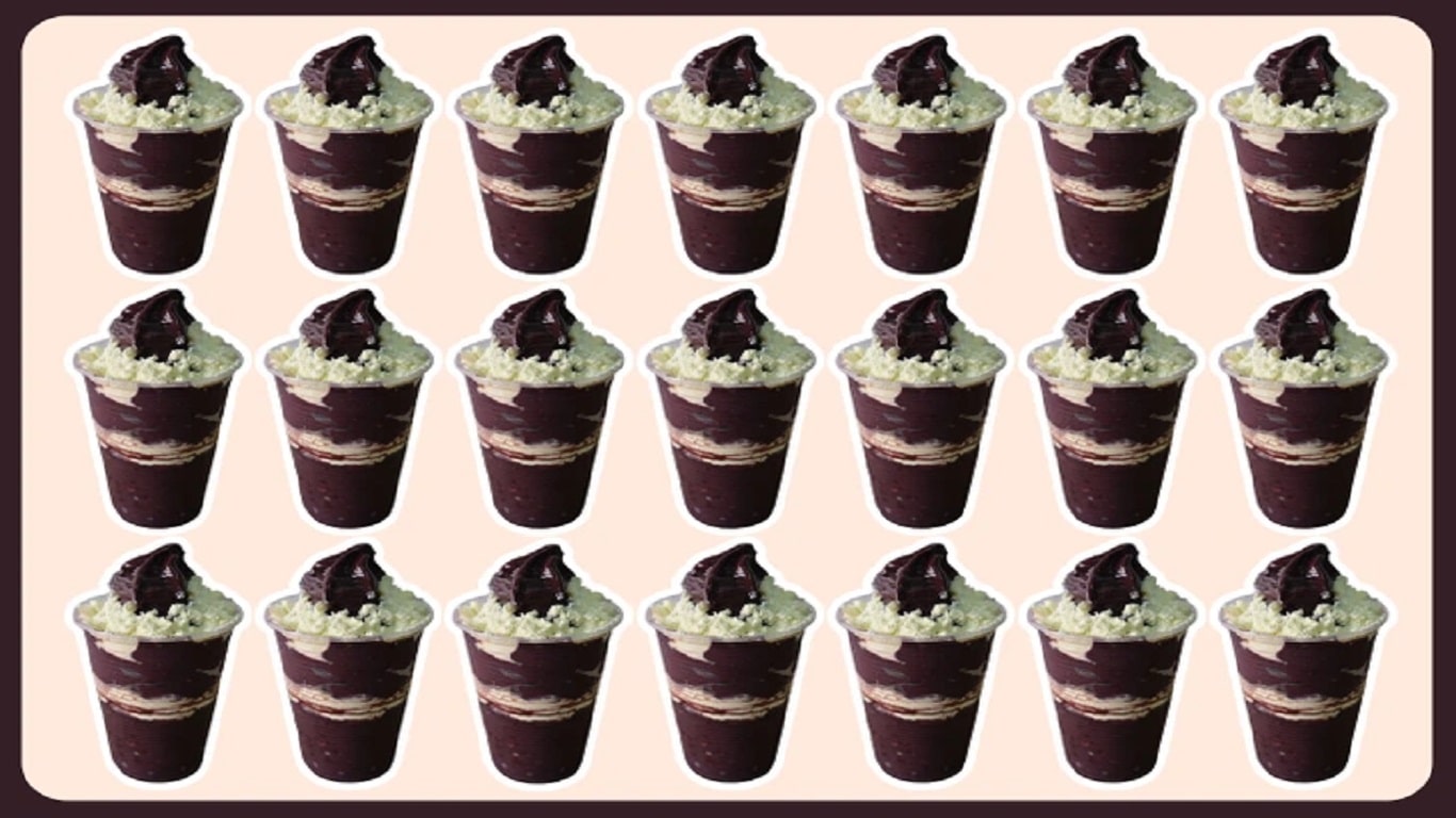 Prepare-se para o desafio de hoje que vai testar sua percepção! Observe com bastante atenção a imagem com vários copos de açaí um ao lado do outro. Você consegue achar o copo de açaí diferente em até 10 segundos?