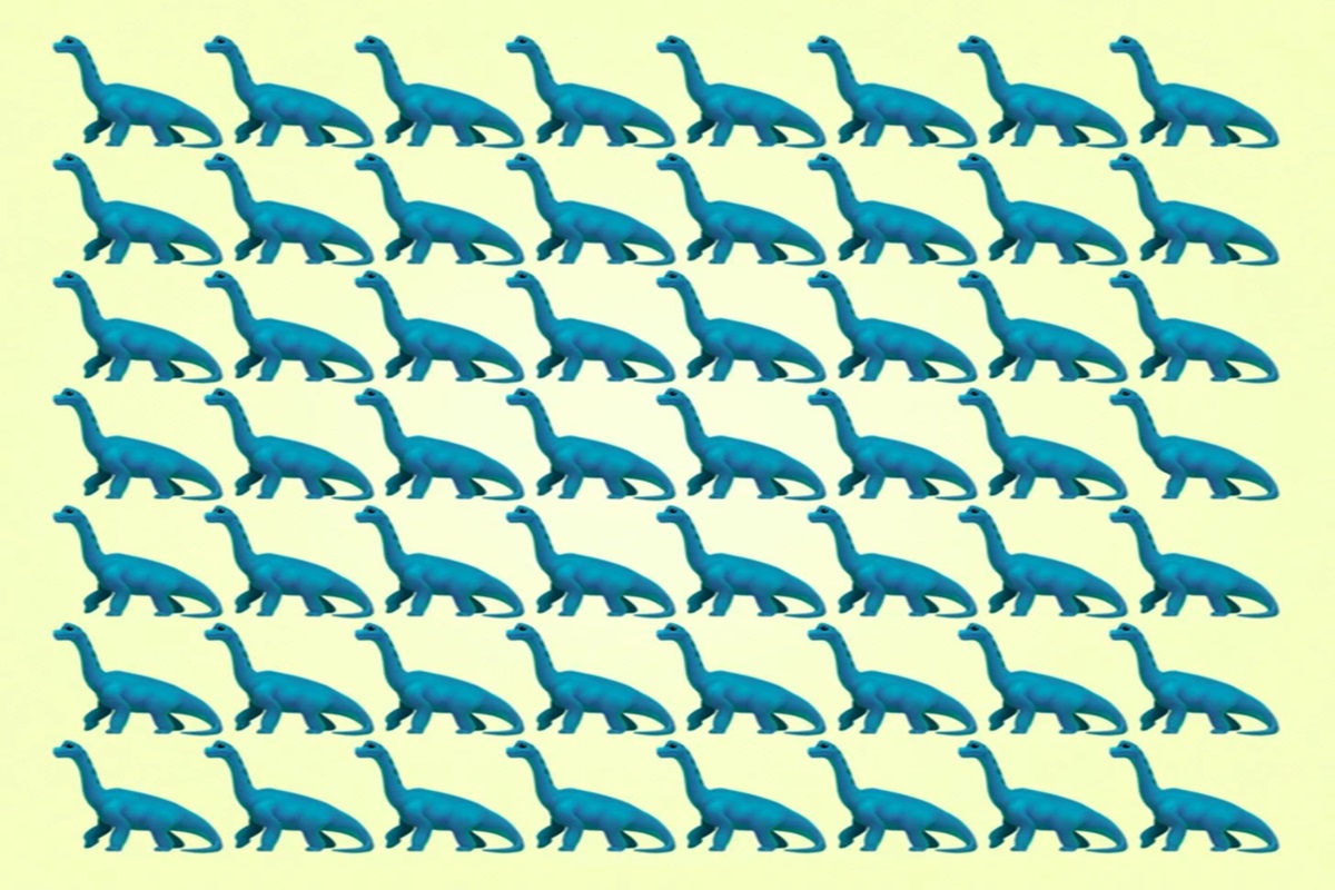 Prepare-se para o desafio de hoje, que vai testar sua percepção! Observe que a imagem mostra uma repetição organizada de dinossauros azuis em estilo simples, organizados em linhas sobre um fundo amarelo. Será que você consegue encontrar o dinossauro diferente nesta imagem em até 10 segundos?