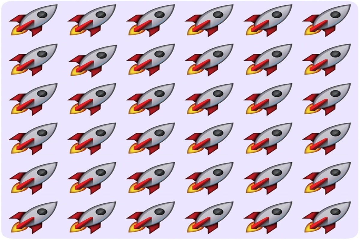 A imagem apresenta várias linhas de foguetes em um fundo lilás, permitindo que você teste sua percepção visual. O objetivo é encontrar o foguete fora do padrão camuflado entre diversos foguetes, com um limite de 20 segundos para concluir a tarefa.