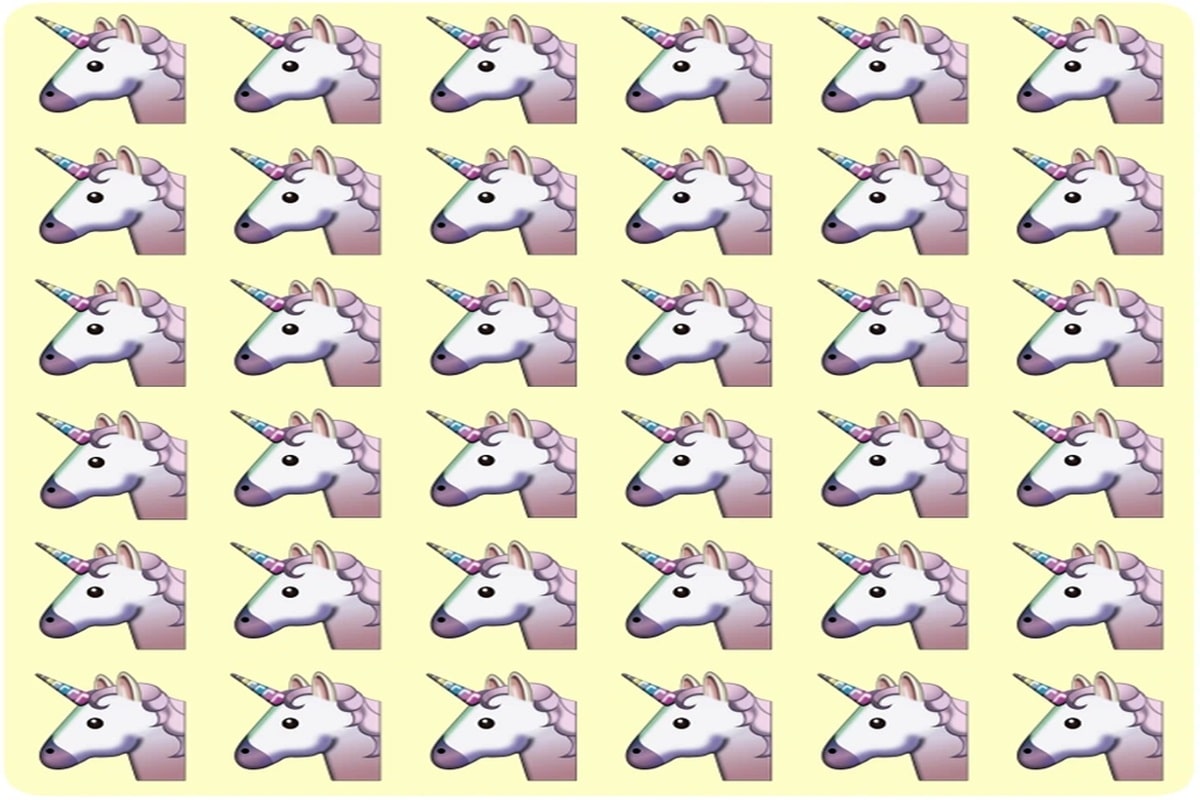 A imagem com trinta e seis emojis de unicórnio distribuídos em seis linhas e seis colunas, criando um padrão sobre fundo amarelo. O desafio é achar o unicórnio fora do padrão na imagem em até 30 segundos, testando a sua atenção. Esse tipo de teste de atenção e concentração é ideal para quem curte desafios rápidos e interessantes, além de ser uma excelente maneira de exercitar o cérebro todos os dias.