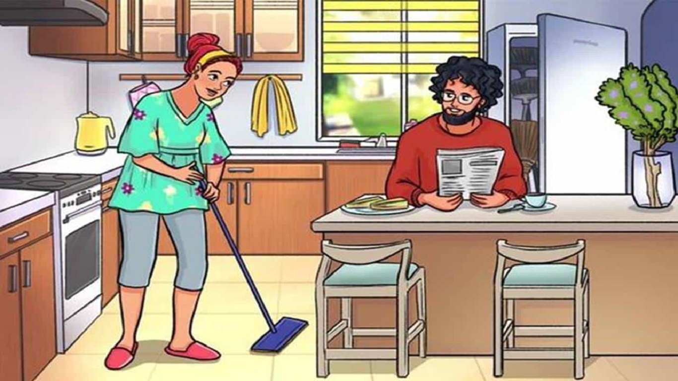 Ao se iniciar o teste, o participante deve observar atentamente a imagem apresentada por até 10 segundos. O cenário é de uma cozinha onde um casal interage: o marido está lendo um jornal enquanto a esposa passa pano no chão. O objetivo é encontrar o erro na cena. Pode ser um detalhe sutil na interação entre os personagens ou um item da cozinha que não se encaixa no contexto da atividade. Este tipo de teste visual é projetado para desafiar a atenção aos detalhes e a capacidade de observação do participante, promovendo assim um treino divertido e estimulante para a mente.