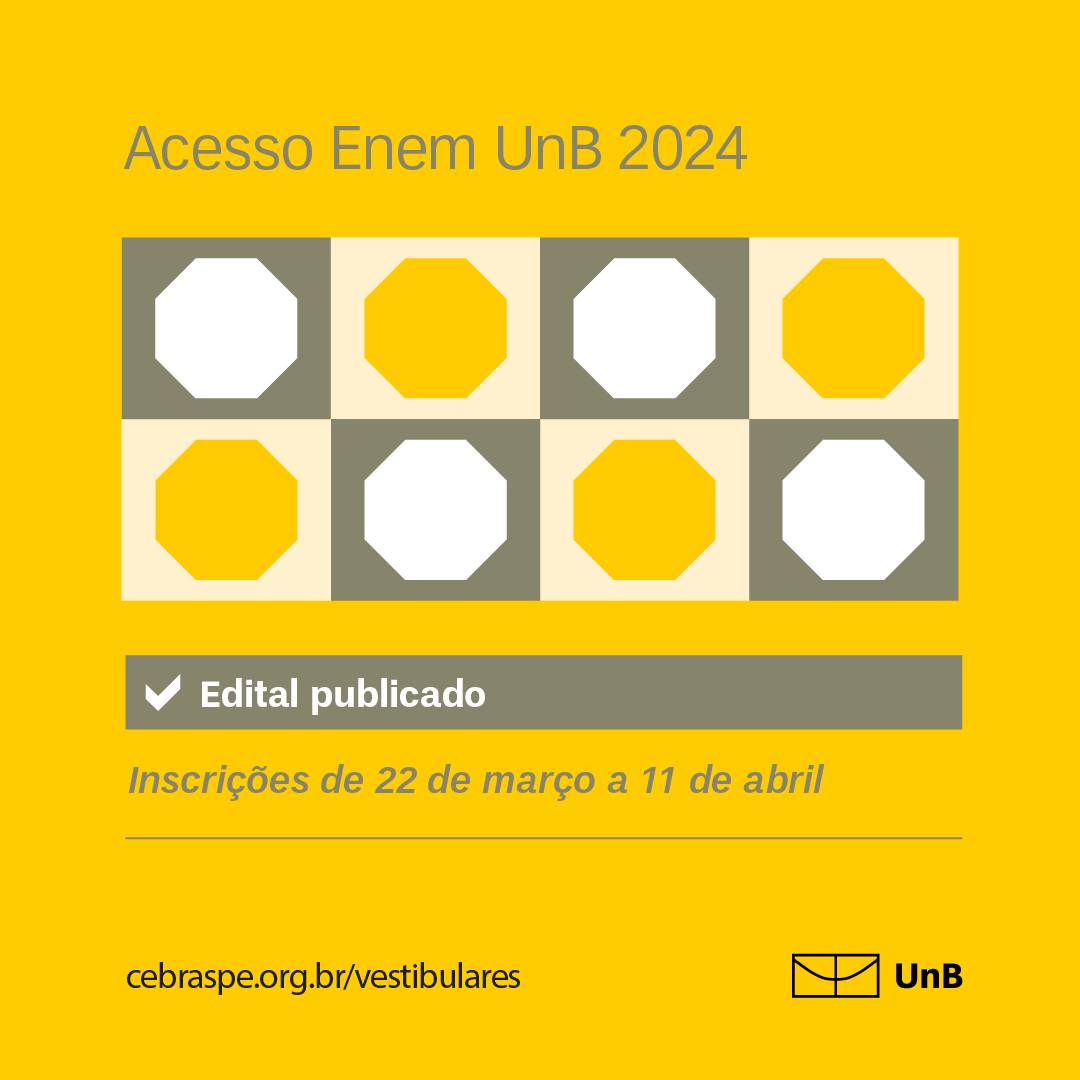 Conforme indicado no calendário oficial do processo seletivo, as inscrições para o Vestibular via ENEM da UnB, chamado de “Acesso ENEM 2024”, começam nesta sexta-feira, dia 22 de março.