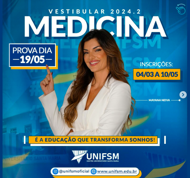 O Vestibular de Medicina 2024/2 da UNIFSM prevê a aplicação de uma prova presencial para todos os candidatos no dia 19 de maio de 2024, de forma presencial na sede da UNIFSM, das 08h às 13h. O candidato deverá comparecer ao local das provas, com no mínimo 60 minutos de antecedência.