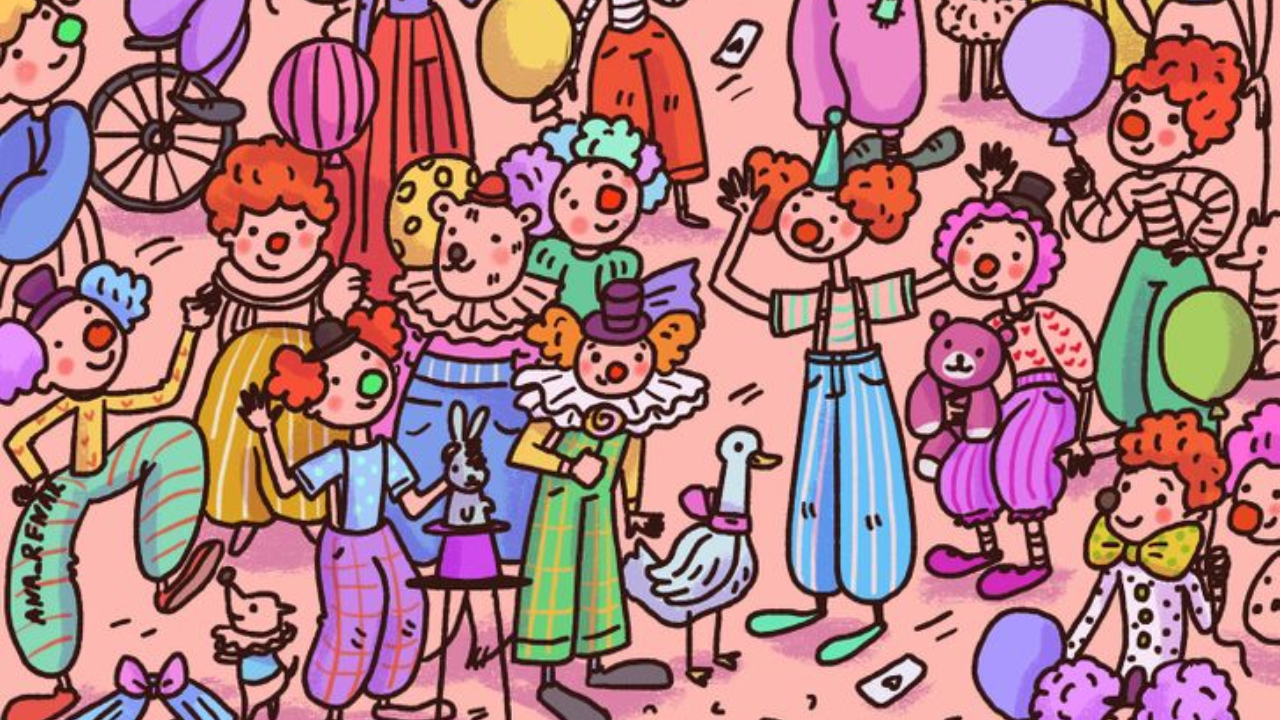 Visualize uma imagem vibrante, um cenário ricamente colorido onde a cada olhar, um novo detalhe surge. Neste cenário específico, um pôster com fundo rosa se destaca, repleto de palhaços coloridos dispostos lado a lado.