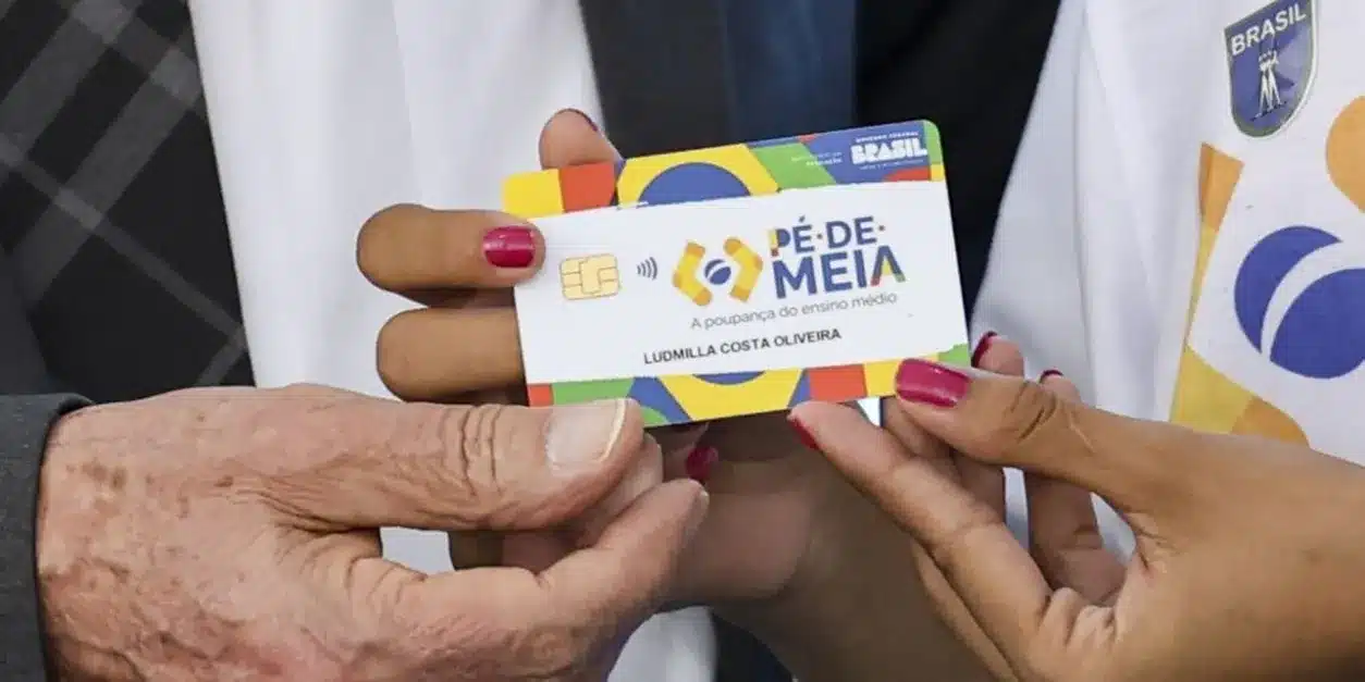 Cartão do programa Pé-de-Meia sendo entregue por duas pessoas, com foco nas mãos e no cartão colorido com o nome Ludmilla Costa Oliveira.