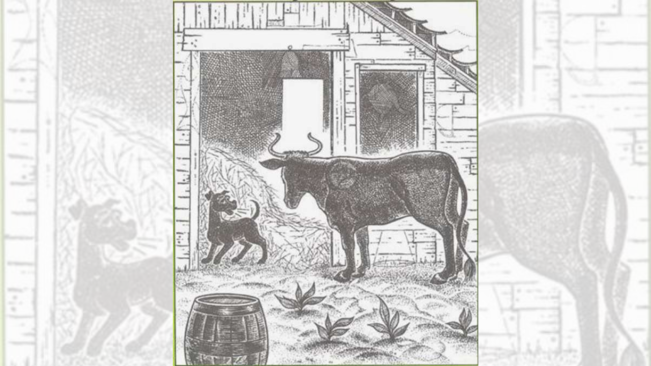 Além disso, é possível avistar um cachorro e uma vaca no cenário, mas o que realmente importa são os dois veados habilmente escondidos. O cachorro, atento e em posição de alerta, parece estar determinado a encontrá-los.