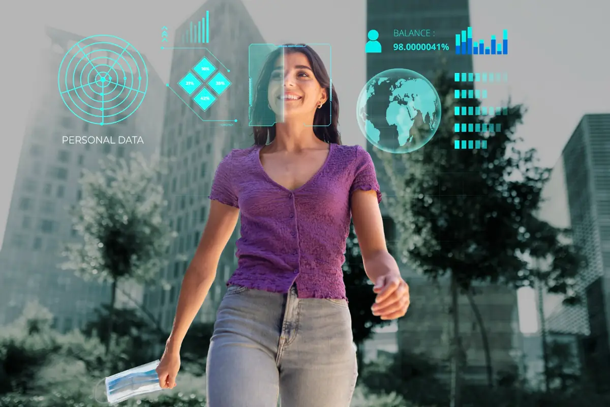 Mulher caminhando pela cidade com gráficos e dados digitais interativos flutuando ao redor.