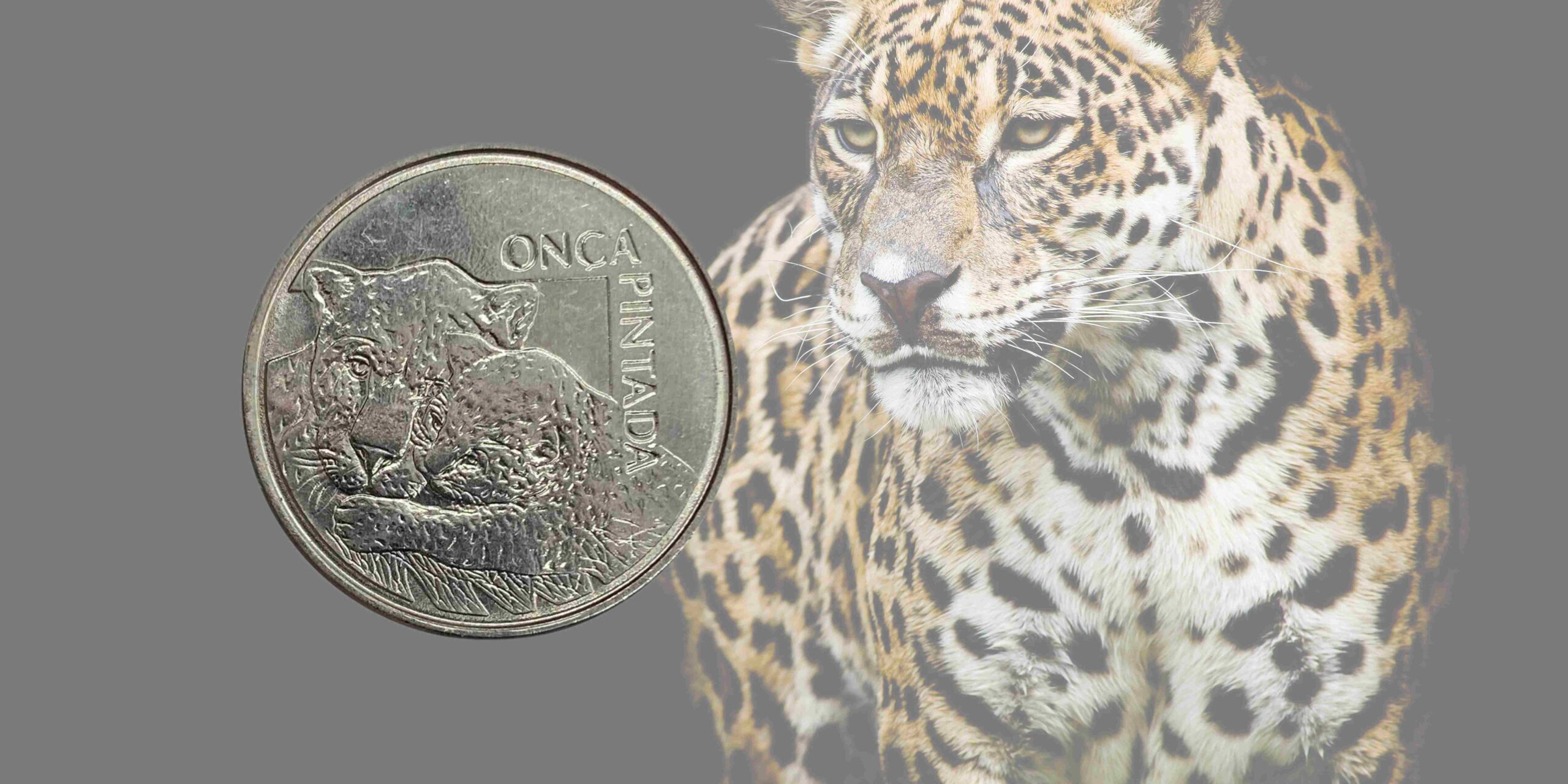 Além disso, essa peculiar peça carrega a representação de duas onças pintadas, uma iniciativa da Casa da Moeda para destacar a preocupação ambiental com o risco de extinção desses animais na época.