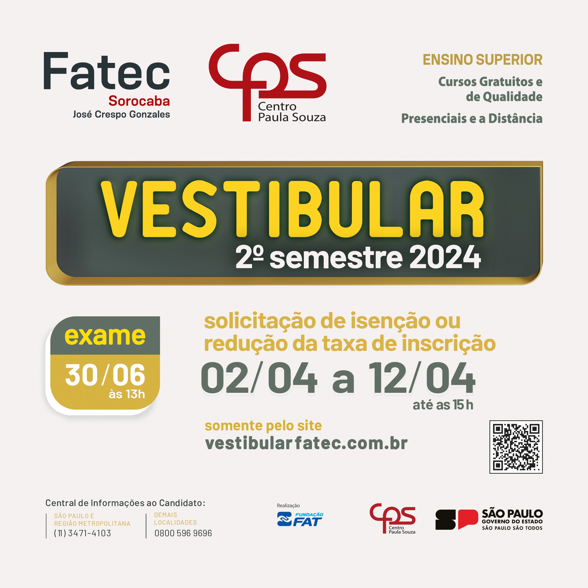 Ficou com alguma dúvida sobre a isenção e a redução da taxa de inscrição do Vestibular 2024/2? Acesse o site das Fatecs e confira mais informações sobre o processo seletivo.
