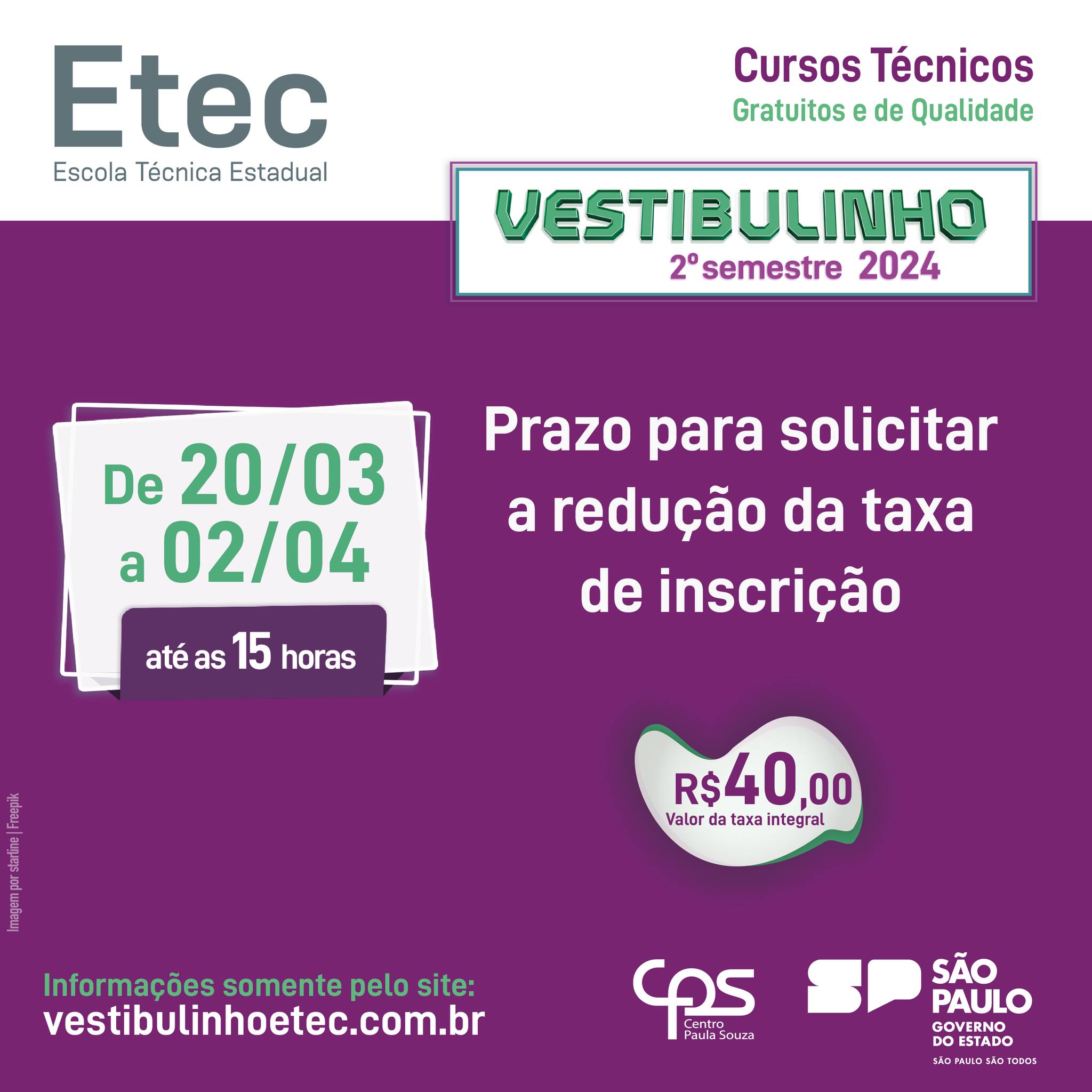 Os estudantes que querem estudar na nas Etecs devem ficar atentos: os pedidos de redução da taxa de inscrição do Vestibulinho 2024/2 serão recebidos a partir desta quarta-feira, 20 de março.
