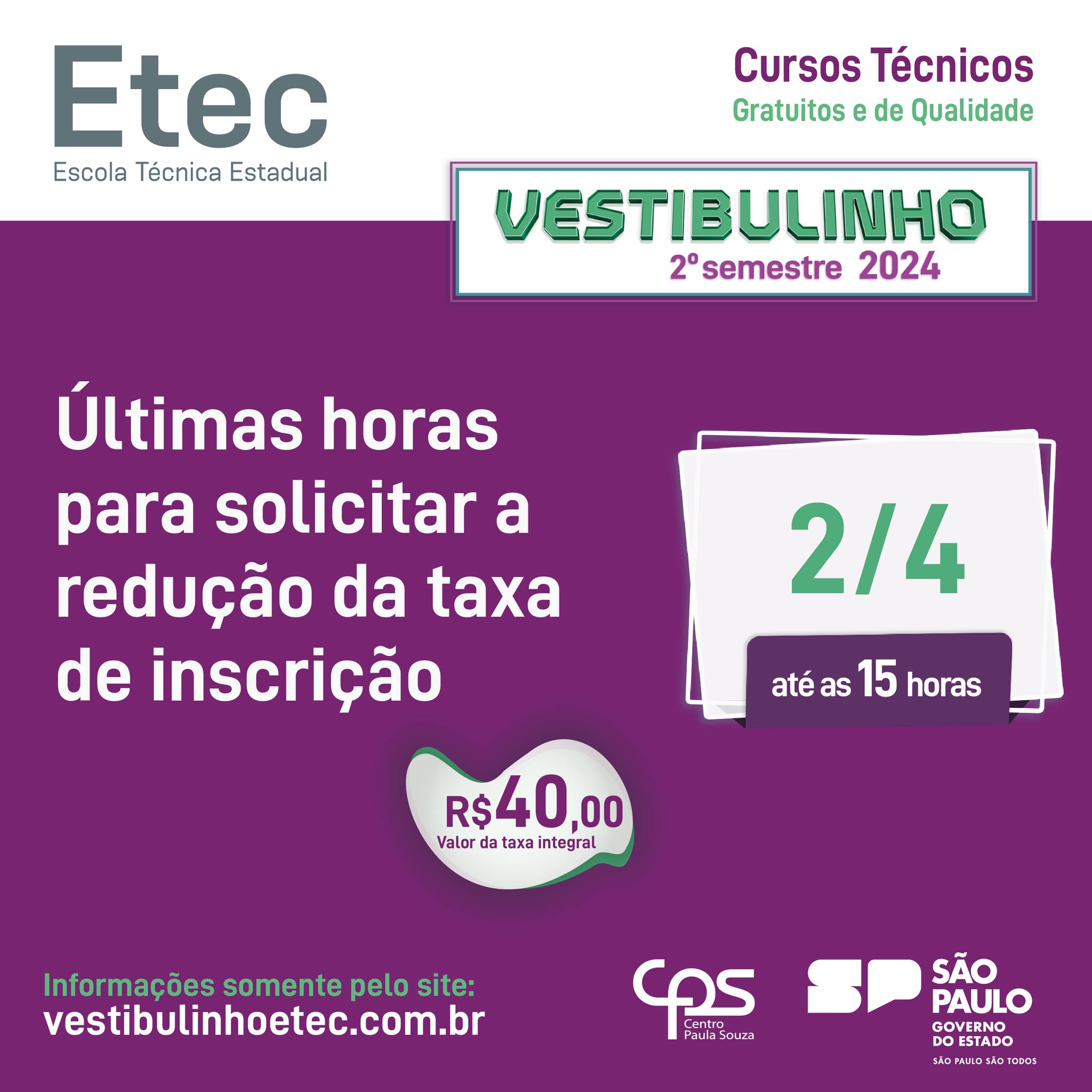 Os estudantes que querem estudar na nas Etecs devem ficar atentos: os pedidos de redução da taxa de inscrição do Vestibulinho 2024/2 ainda estão sendo recebidos, mas o prazo termina nesta terça-feira, 02 de abril.
