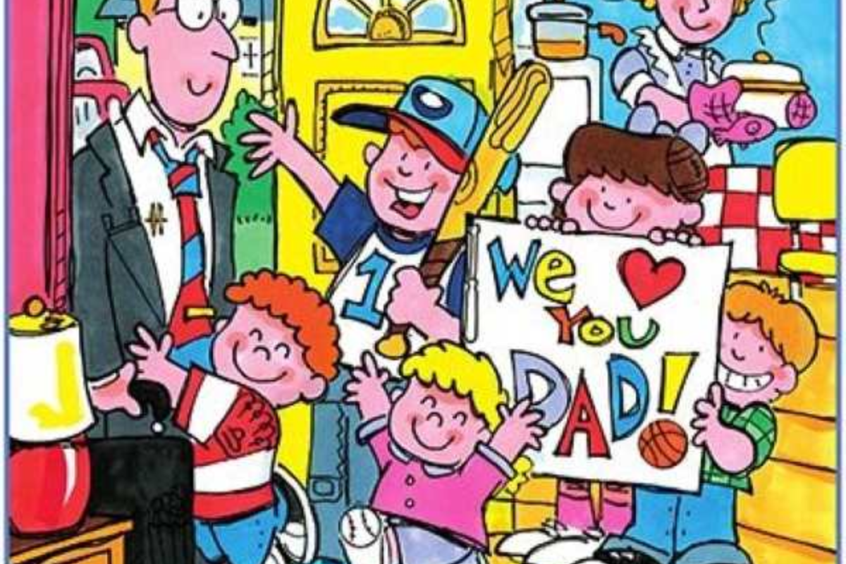 Na imagem, vemos uma cena colorida e alegre de uma família celebrando o pai. À esquerda, o pai, vestido com um terno, parece estar chegando em casa, enquanto é recebido calorosamente por seus filhos. As crianças estão sorridentes e animadas, segurando um cartaz que diz “We Love You Dad!” com letras coloridas e vibrantes. Ao fundo, a mãe também participa da cena, segurando um prato na cozinha, enquanto observa a recepção carinhosa. A imagem transmite uma atmosfera de celebração familiar, com cores vivas e expressões felizes em cada personagem.