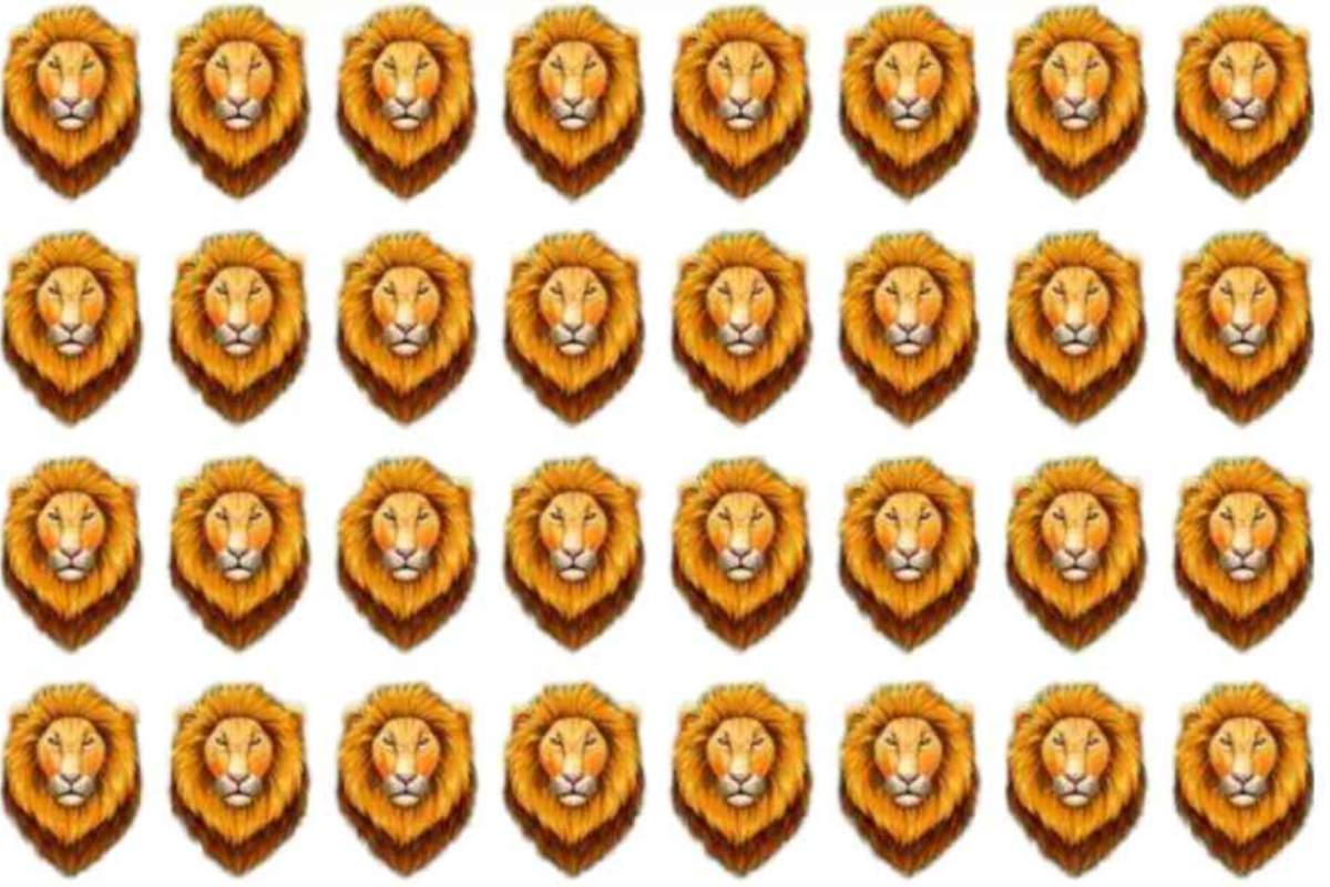 Agora, aqui está o seu desafio: em meio a essa simetria, você consegue encontrar o leão que se destaca dos outros? Ele está escondido entre os demais, e sua tarefa é localizá-lo o mais rápido possível. Concentre-se nos detalhes e veja se você consegue identificar o leão diferente em 6 segundos! Boa sorte!