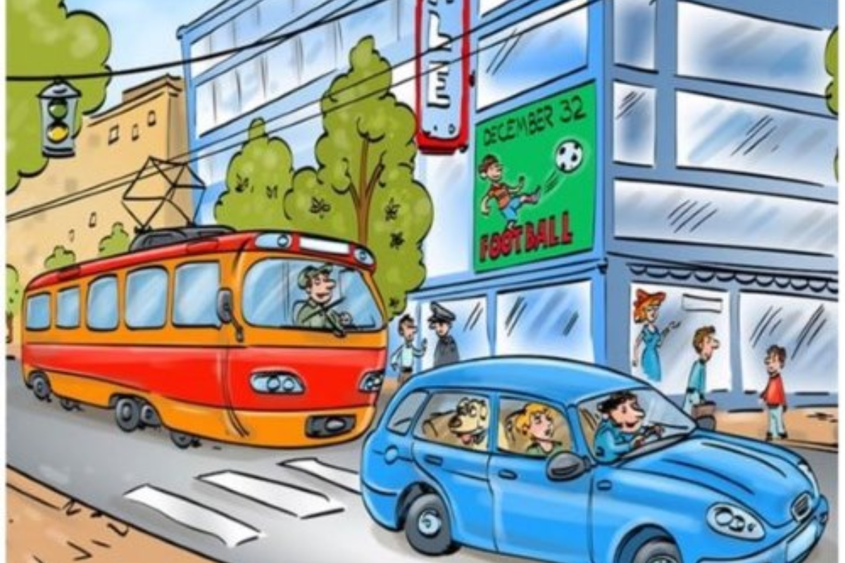 A imagem retrata uma movimentada cena urbana. Em primeiro plano, vemos um carro azul com três pessoas dentro, incluindo uma criança no banco traseiro. Ao lado do carro, há um bonde vermelho seguindo pela rua. Ao fundo, há um grande edifício com janelas espelhadas e uma placa que anuncia um evento de “FootBall”. Ao redor da cena, vemos pedestres caminhando e algumas árvores que adicionam um toque de natureza à cidade.