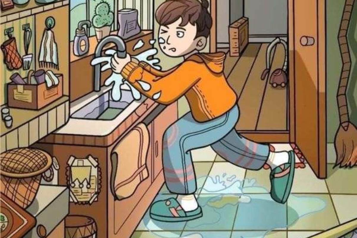 Na imagem, vemos uma pessoa jovem em uma cozinha, concentrada em lavar as mãos na pia, mas com água derramando, criando uma bagunça no chão. A cozinha está repleta de objetos, como plantas, utensílios, uma caixa de papelão e até um robô aspirador ao fundo. A tarefa, porém, é encontrar a escova escondida entre esses itens.