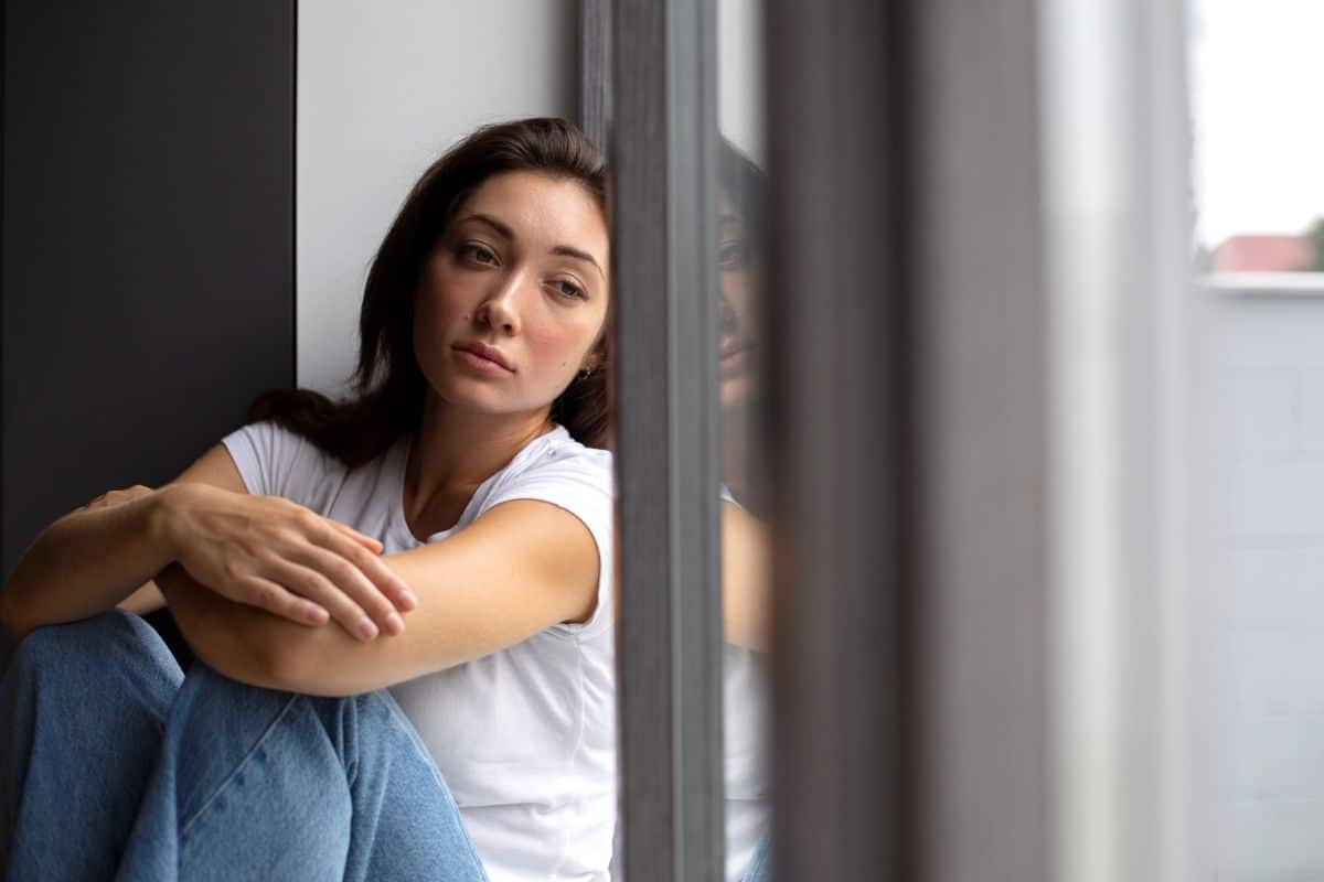 Jovem mulher triste ou introspectiva sentada em casa (Sinais de baixa autoestima por tentar agradar os outros)
